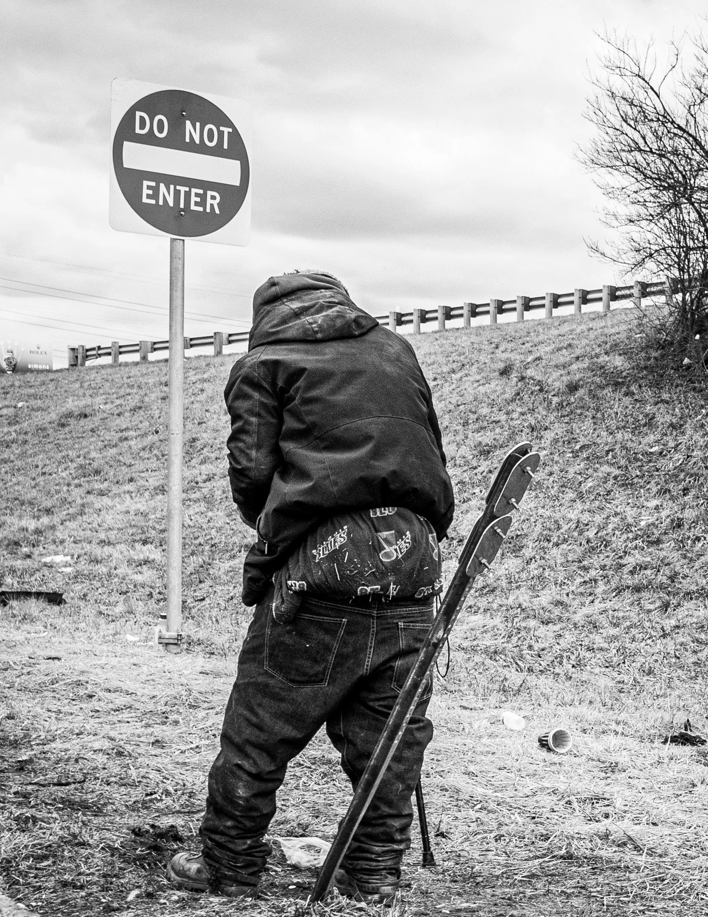 “In this evocative monochrome shot from my collection, I captured a lone figure standing defiantly next to a "DO NOT ENTER" sign. Wearing a well-worn jacket and jeans adorned with various patches, the individual's posture leans slightly, holding what appears to be a slender object or makeshift instrument. I was struck by the bleakness of the landscape, with its dormant grass and a singular, leafless tree. For me, the stark sign symbolized societal barriers or unspoken boundaries. The scene's scattered debris and the distant fence further underscored a sense of isolation, emphasizing themes of resilience amid adversity.”